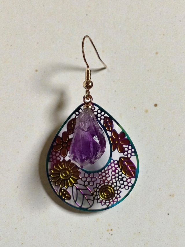 Gold plated 925 sterling silver hooks with genuine Raw Amethyst beads and irredescent charms.