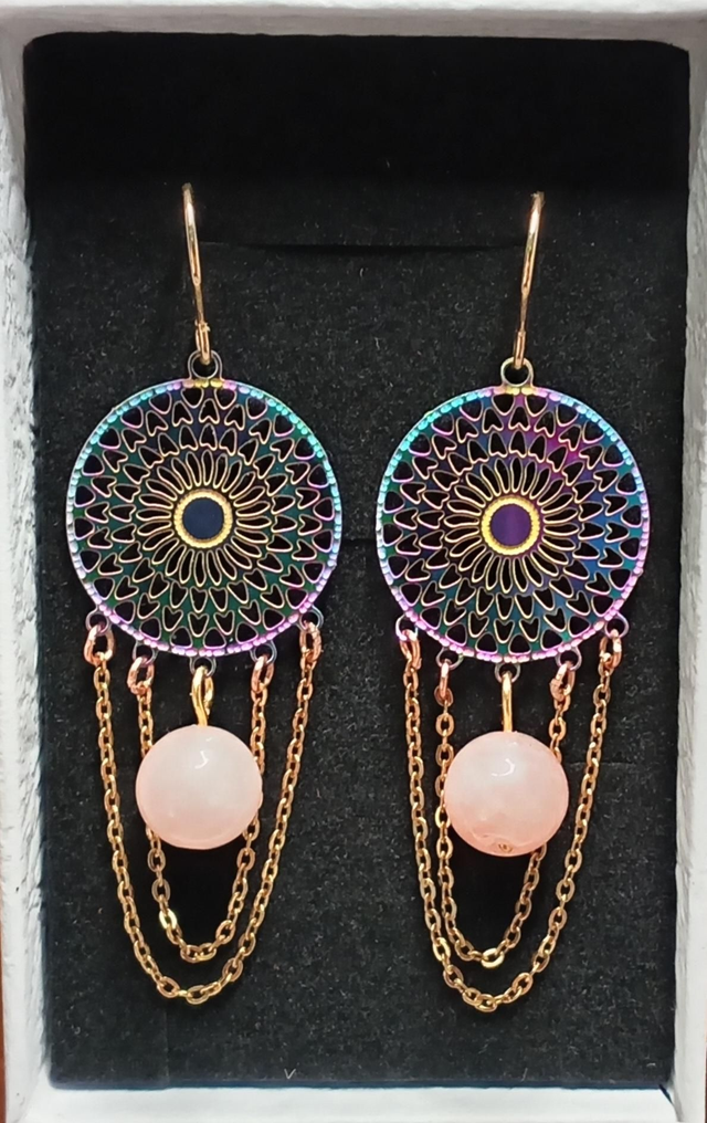 Genuine Morganite beads on surgical steel gold plated hooks accented with gold plated chain and multicolored charms.